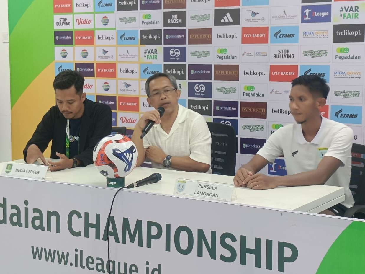 Pelatih Persela Aji Santoso memberikan keterangan pers seusai pertandingan, di Stadion Surajaya Lamongan, Senin (6/10/2025), Foto : official persela for nowtooline)